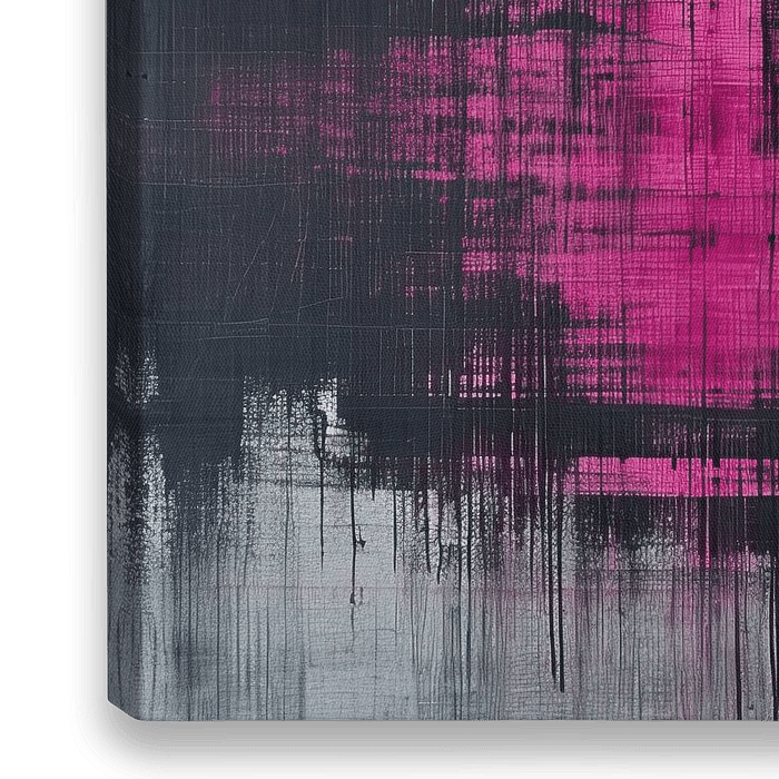 Modern Art | Pink - Dieses ausdrucksstarke abstrakte Kunstwerk besticht durch den starken Kontrast zwischen tiefschwarzen Tönen und einem leuchtenden Rosaton, der die Leinwand dominiert. Die Verwendung gerader Linien und eines fast digital anmutenden Gittermusters verleiht dem Werk ein modernes und urbanes Gefühl, das sich perfekt für…