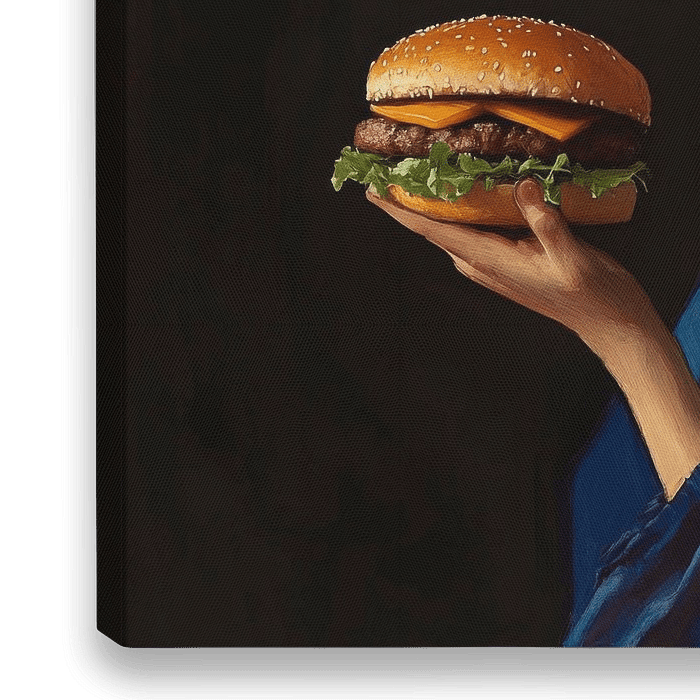 Das Bild kombiniert klassische Malerei mit modernen Elementen: Ein Mädchen in traditioneller Kleidung hält einen saftigen Burger, während sie drahtlose Kopfhörer trägt. Die Kontraste zwischen dem historischen Gewand und dem zeitgenössischen Fast Food erzeugen eine faszinierende Spannung und laden zur Auseinandersetzung mit unserer…