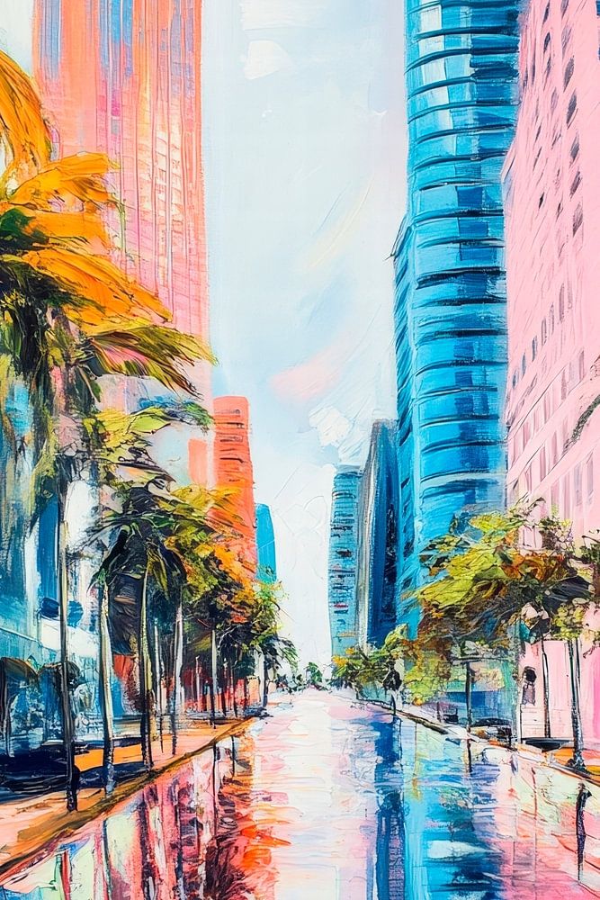 In bunten Farben schimmert eine lebhafte Stadtansicht unter strahlendem Himmel. Die Palmen wiegen sanft im Wind und reflektieren das pulsierende Leben des urbanen Treibens im Wasser. Diese dynamische Darstellung verleiht jedem Wohnzimmer eine frische, tropische Atmosphäre, die zum Träumen einlädt und die Sinne belebt.