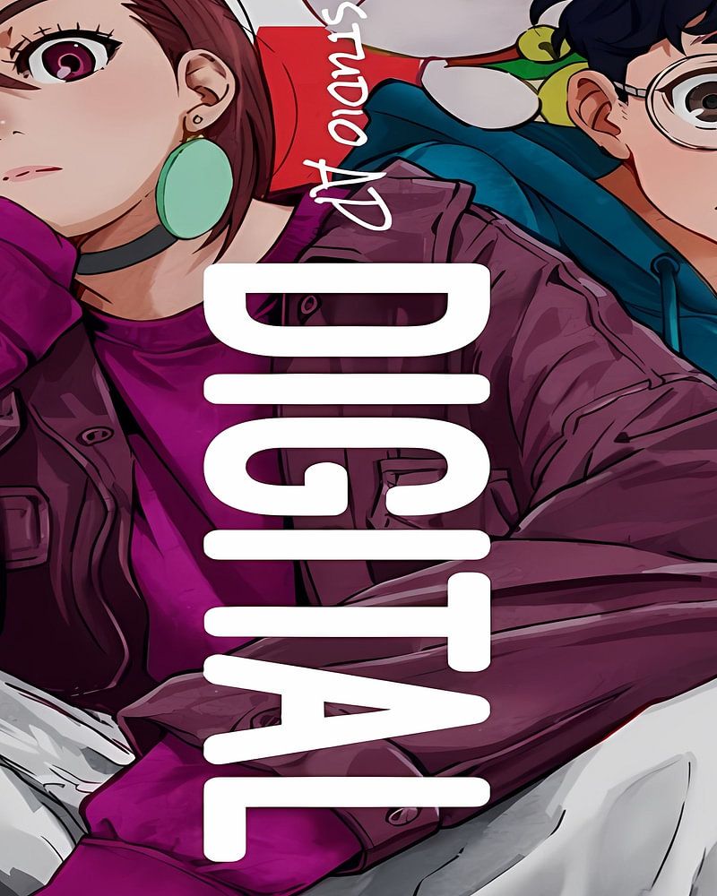 Entspanntes und doch stilvolles Porträt von zwei Anime-Figuren, umgeben von einem kühnen und grafischen Design. Der Kontrast von hellen Farben und urban inspirierter Mode schafft eine moderne digitale Kunstästhetik.
