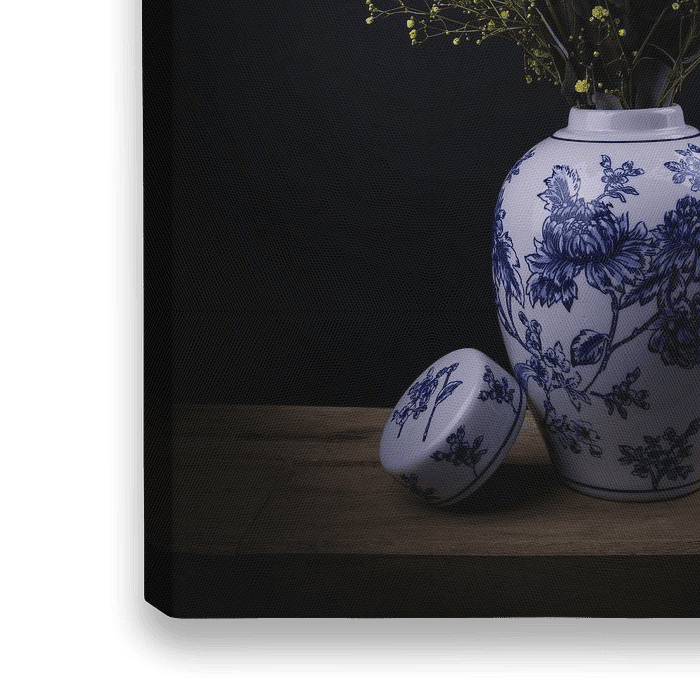 Foto eines Stillebens mit blauen und gelben Blumen in einer blauen Delfter Vase. Digital manipuliert mit einer großen Meise und Schmetterling.