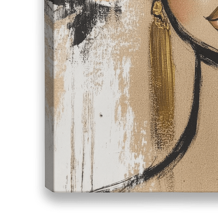 Modernes Porträt einer jungen Frau mit goldenen Ohrringen und rosa Blume im Haar. Ein besonderer Blickfang für Ihr Interieur! Wählen Sie die Größe und das Material für dieses Werk und machen Sie es zu Ihrem eigenen.