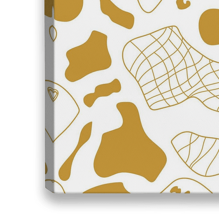 Modernes abstraktes Muster in Senfgelb auf weißem Hintergrund. Auch sehr schön als Hintergrundbild! Kreise, Linien, Streifen, offene und geschlossene Formen, sich wiederholende Muster. Digitale Collage / Illustration.