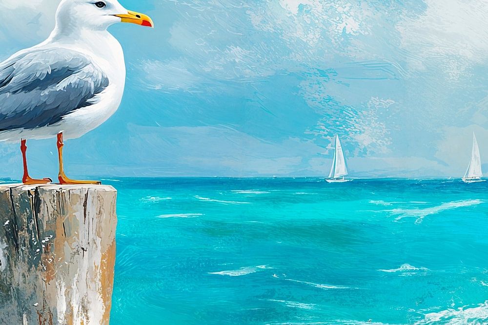 Hoch oben auf einem verwitterten Steg thront eine elegante Möwe, umgeben von sanften Wellen in schimmernden Blau- und Türkistönen. Der Himmel erstrahlt in einem Spiel aus Licht und Wolken, während Segelboote in der Ferne sanft dahin gleiten. Dieser ruhige Moment strahlt eine gelassene Meeresstimmung aus, eingefangen in zeitloser Schönheit.