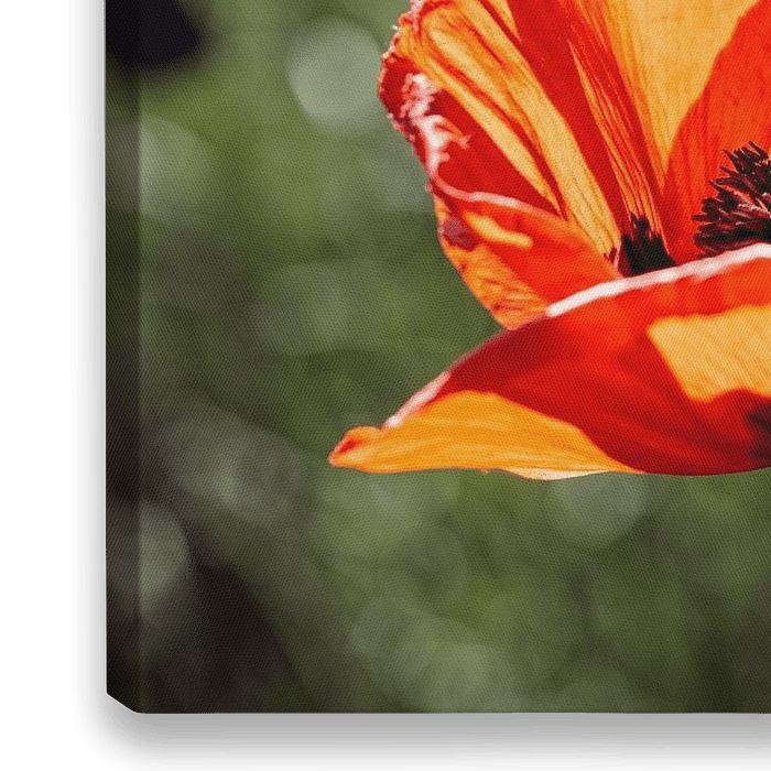 Nahaufnahme der Blüte eines orangefarbenen Mohns mit Sonnenlicht, das durch die sehr dünnen Blütenblätter scheint.