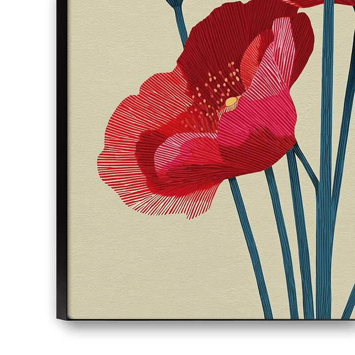 Eine Mohnblume entfaltet ihr feuriges Rot, ausgeschnitten in engen, geometrischen Linien wie in einem Blockdruck. Schwarze Umrisse rahmen jedes Blütenblatt ein, während das Herz als tiefes, dunkles Punktmuster kontrastiert. Der Stängel und die Blätter sind vereinfacht, rhythmisch und kantig, als ob jede Linie absichtlich in Papier geschnitten wurde. Die Komposition wirkt traditionell, handwerklich und doch kraftvoll modern, eingefangen in der zeitlosen Ästhetik des Blockdrucks.