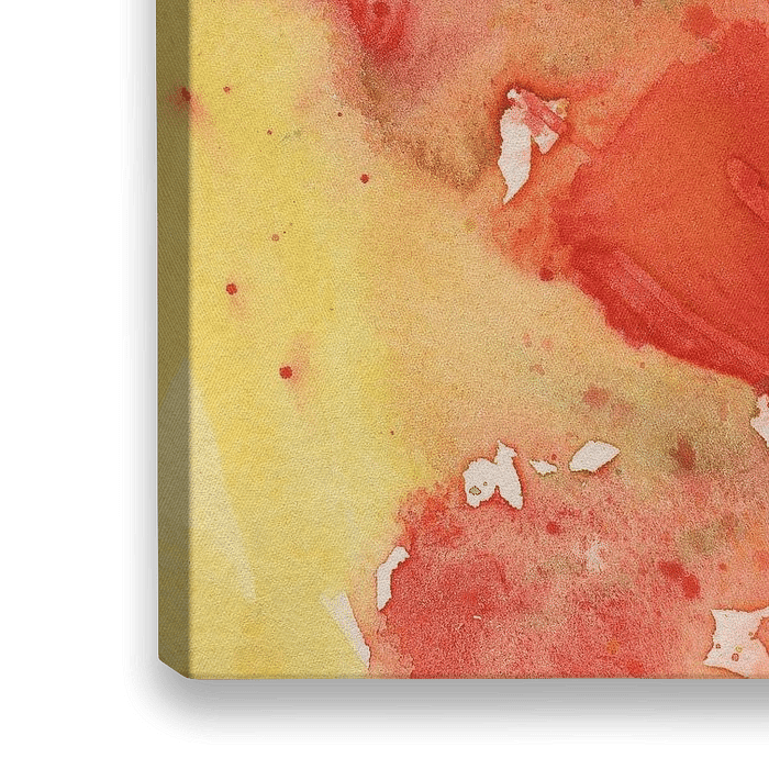 Lebendige Rot- und Gelbtöne verschmelzen zu einer fließenden, abstrakten Darstellung einer wunderschönen Mohnblume. Dezente Weißtöne bilden einen Kontrast zu den lebendigen Farben und vermitteln den Eindruck von Leichtigkeit innerhalb der Komposition. Das Bild ist mit lockeren Pinselstrichen in einem frischen Stil gemalt, wie eine erfrischende Sommerbrise, die die Mohnblumen in einer Wildblumenwiese wiegt.