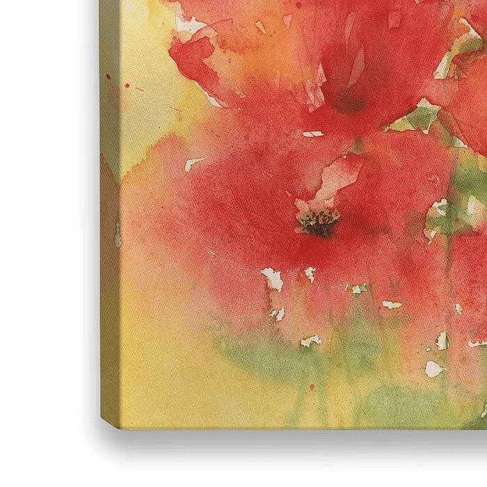 Leuchtend rote Mohnblumen heben sich mit ihrer satten Farbe von einem sanft gelben und grünen Hintergrund ab und vermitteln den Eindruck einer blühenden Wiese oder eines Getreidefeldes. Das Bild wurde in einem lockeren frischen Stil gemalt, was den Blumen ein zartes und ätherisches Aussehen verleiht, mit Blütenblättern, die mit dem sie umgebenden Raum zu verschmelzen scheinen.