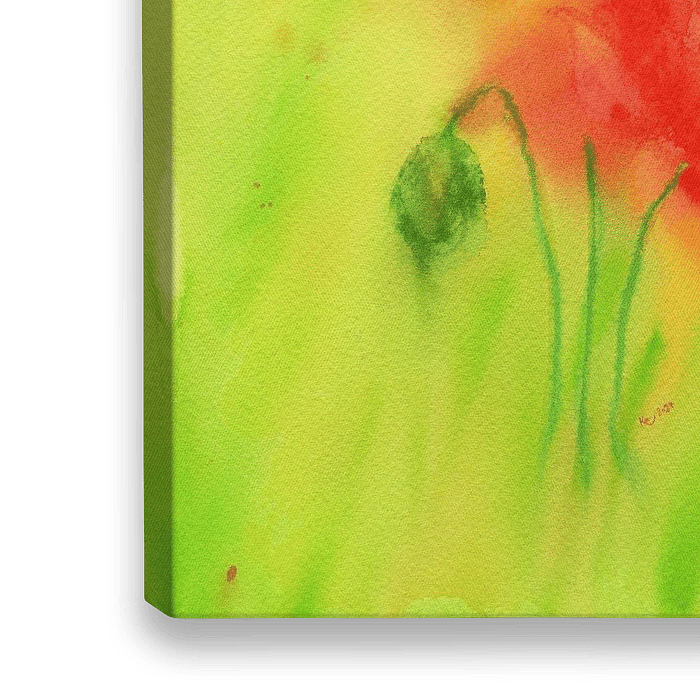 Zwei leuchted rote Mohnblüten erblühen vor einem Hintergrund in frischen Gelb- und Grüntönen. Die Blüten sind locker und luftig dargestellt und kontrastieren mit dem Hintergrund, den zarten grünen Stängeln und einer einzelnen ungeöffneten Knospe. Die sanft verschwommene Darstellung der Blütenblätter verleiht dem Bild eine ruhige, träumerische und ätherische Qualität.