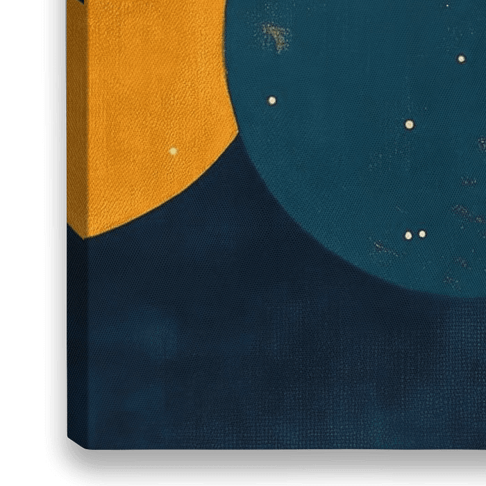 Ein harmonisches Spiel aus sanften Farben und mystischen Formen entfaltet sich vor dem Betrachter. Die halbmondförmigen Elemente in strahlendem Gold und beruhigendem Blau evokieren die Magie der Nacht und laden zur Träumerei ein. Perfekt geeignet für das Schlafzimmer, verleiht dieses Kunstwerk eine Atmosphäre der Ruhe und des Staunens.