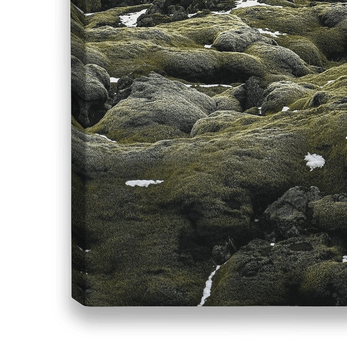 Grüne Mooshügel mit Schneeresten in den vulkanischen Ebenen Südislands an einem dunklen Tag. Das Grün fügt sich gut in den dunklen Hintergrund ein.