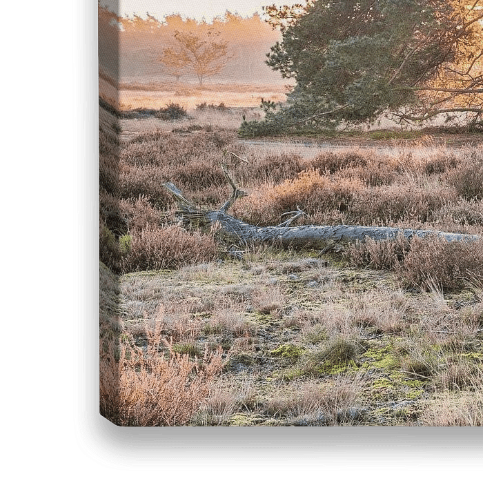 Ein frischer Morgen auf der Heide, die Sonne scheint durch den einsamen Baum. Ein schönes Stimmungsfoto, das sich gut an der Wand machen würde!