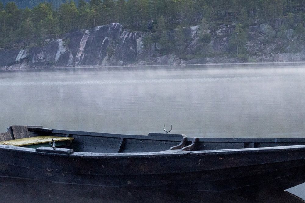 Wenn man durch Südnorwegen durch die Fjorde fährt, kann man sehr oft einen solchen Anblick mit einem leeren Boot auf ruhigem Wasser erleben.