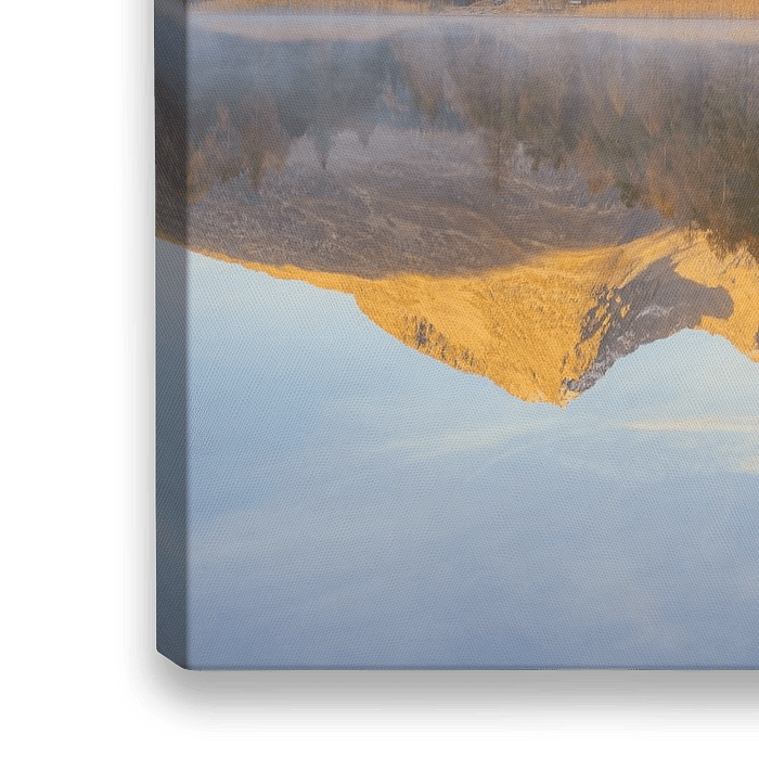 Frühmorgens am Stazersee bei St. Moritz im Engadin. Die aufgehende Sonne bringt die Berggipfel zum Glühen, leichte Nebelschwaden wabern über den See. Das Wasser ist so ruhig und glatt, dass es eine perfekte Spiegelung gibt.