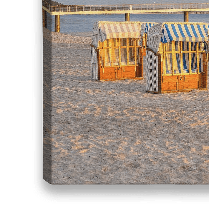 An einem bewölkten Morgen schafft es die Sonne kurz durch die Wolkendecke und taucht die Seeschlösschenbrücke mit dem Teehaus am Ende und die Strandkörbe am Strand in ein warmes Licht.