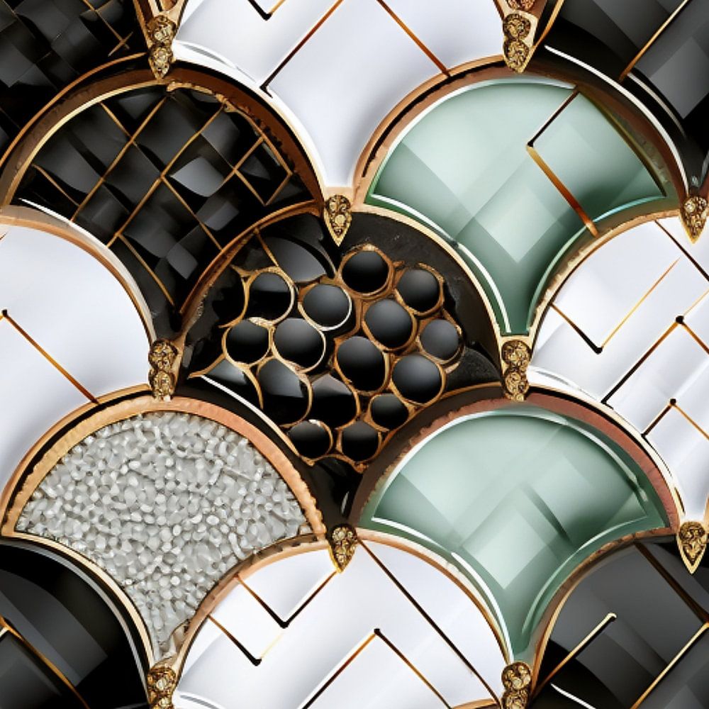 Das Bild zeigt ein dekoratives Mosaikmuster in Fischschuppenform mit metallischen Konturen. Jede einzelne Schuppe ist mit unterschiedlichen Texturen und Farben versehen, darunter Schwarz, Weiß, Grün, Gold und Kupfer. Die Oberflächen variieren von glänzend und glatt bis hin zu strukturiert und gemustert. Das Design wirkt luxuriös und dreidimensional, mit einem Fokus auf geometrischer Vielfalt und edler Optik.