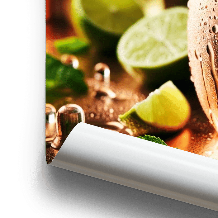 Das Bild "Moscow Mule" präsentiert den gleichnamigen Cocktail in einem klassischen Kupferbecher, der für seine Fähigkeit bekannt ist, das Getränk außergewöhnlich kühl zu halten. Die außen am Becher kondensierenden Wassertropfen unterstreichen die erfrischende Kälte des Cocktails. Angereichert mit einer lebendigen Limettenscheibe und…