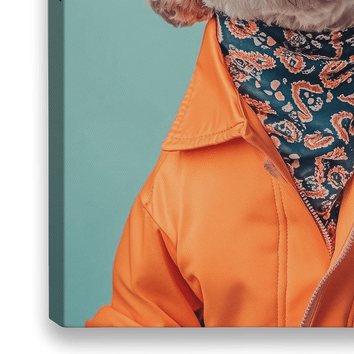 Mit einem lässigen orangefarbenen Outfit und stylischen Sonnenbrillen strahlt dieser Mudi voller Charisma. Sein schickes Halstuch und der freche Gesichtsausdruck verleihen ihm einen unkonventionellen Look, der zugleich charmant und humorvoll wirkt. Ein echter Trendsetter unter den Vierbeinern, der bereit ist, die Welt zu erobern!