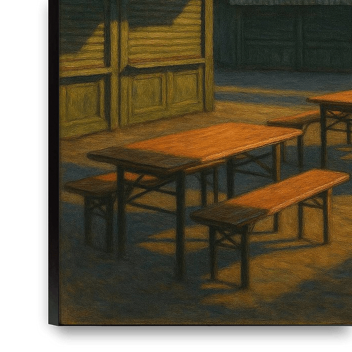 Dieses charmante und stimmungsvolle Gemälde fängt einen seltenen Moment der Stille auf dem belebten Münchner Viktualienmarkt ein. Die Szene zeigt den Markt, nachdem sich die Menschenmassen zerstreut haben, mit den ikonischen grünen Holzbuden und gestreiften Markisen, die für den Abend geschlossen sind. Im Vordergrund leuchten leere…