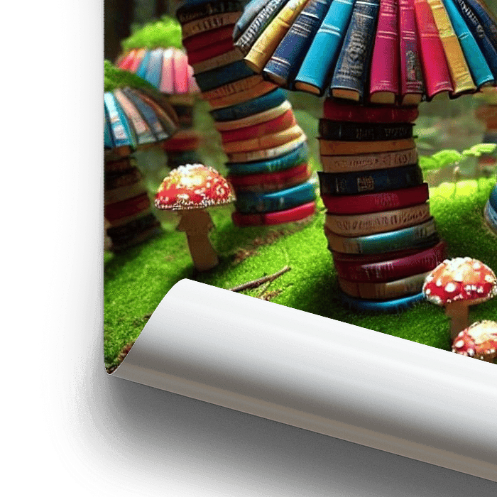 Die detailreiche Darstellung zeigt eine Gruppe von Pilzen, die aus Büchern in allen Farben des Regenbogens zusammengesetzt sind. Die Hüte der Pilze bestehen aus aufgefächerten Buchseiten, die perfekt den Eindruck eines typischen Pilzhuts vermitteln. Moos bedeckt die Oberseite der Pilzhüte und bringt eine harmonische Verbindung zwischen der Buchwelt und der Natur. Im Hintergrund zeichnen sich die dunklen Stämme eines Waldes ab, während der Waldboden mit grüner Vegetation und kleinen Pilzen geschmückt ist. Das Motiv zieht den Betrachter sofort in seinen Bann und bietet unzählige Details, die es zu entdecken gilt.