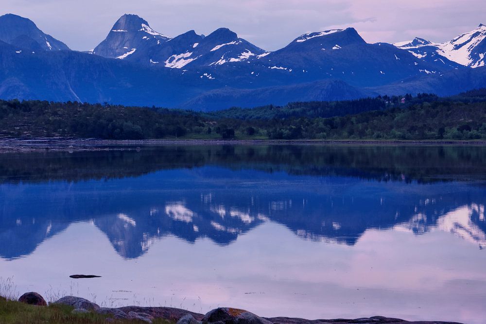 Eine helle Sommernacht am Tysfjord in der Fylke Nordland. Im Hintergrund der Berg Stetind, einer der Nationalberge Norwegens. Landschaft und Natur Nordnorwegen, Lappland. Sommer 2017.