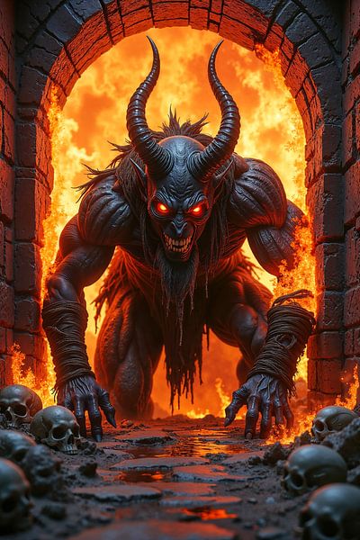 Ein gewaltiger Teufel kriecht durch ein steinernes Tor, umgeben von lodernden Flammen und flüssigem Feuer. Seine massige Gestalt füllt den Durchgang vollständig aus, während glühende Augen aus der Dunkelheit hervorbrechen. Am Boden liegen Schädel und verbrannte Steine, die den Weg aus der Hölle markieren.