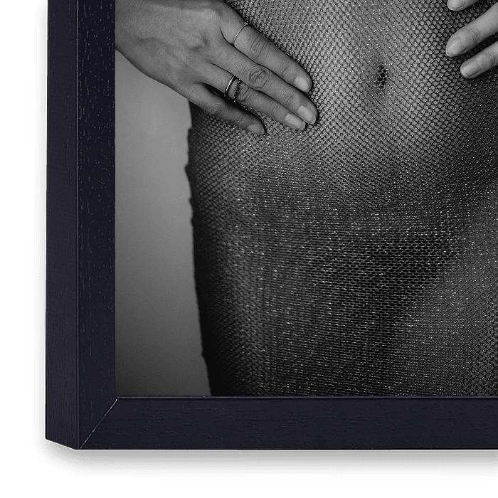 Dieses ausdrucksstarke Bild konzentriert sich auf die Details des menschlichen Körpers. Durch das transparente Gewebe wird die Haut sanft betont, während das Muster des Stoffes ein faszinierendes Zusammenspiel von Struktur und Körperform schafft. Die Pose mit den seitlich aufliegenden Händen vermittelt Selbstbewusstsein und innere Stärke, zugleich aber auch Eleganz und Weiblichkeit. Die Schwarzweiß-Fotografie verstärkt die Wirkung der Kontraste, wodurch der Körper beinahe skulptural erscheint. Jeder Schatten, jede Kontur und jede Linie ist bewusst inszeniert, um die Harmonie zwischen Stoff, Haut und Licht hervorzuheben. Diese Aufnahme ist mehr als nur ein Aktbild – sie ist ein künstlerisches Statement, das die Ästhetik des menschlichen Körpers feiert. Ideal für Kunstliebhaber, die Wert auf reduzierte, klare und gleichzeitig emotionale Fotografie legen. Dieses Werk bringt Eleganz, Tiefe und ein Gefühl von Zeitlosigkeit in jede Sammlung oder in die Gestaltung moderner Räume.