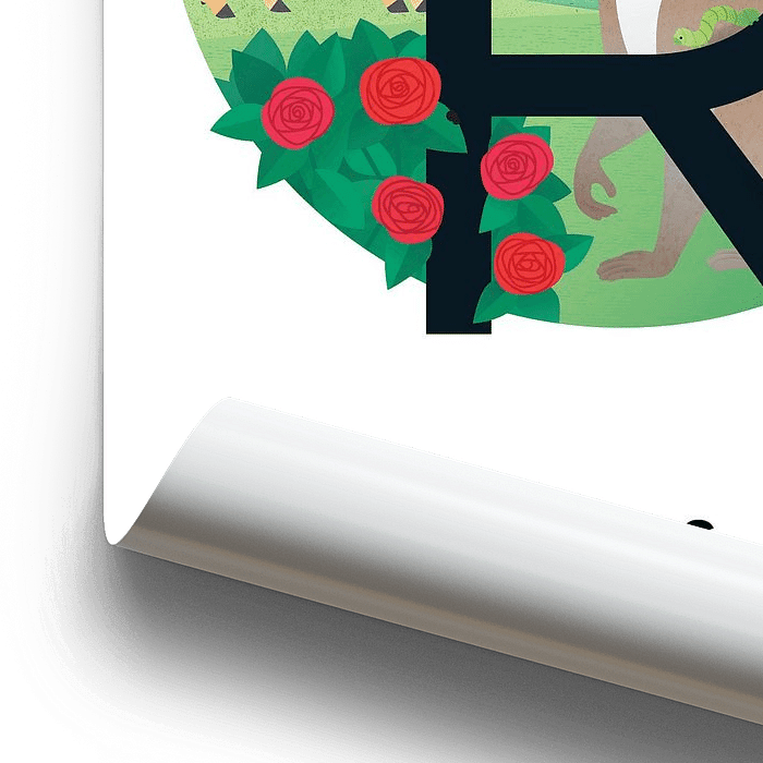 Alles mit dem R. Finden Sie so viele Wörter wie möglich mit dem R. Ein Reh und ein Ringelschwanzlemur zwischen den Rosen und dem Schilf. Der Fluss und eine Schlucht. Ein Reiher auf den Felsen. Ein Regenbogen und eine Rakete. Und auf dem R selbst ist eine Raupe.