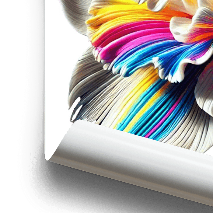 Das Poster zeigt eine atemberaubende Darstellung einer abstrakten Narzisse, deren Blütenblätter in lebendigen Regenbogenfarben leuchten. Diese Blume, inspiriert von einer Narzisse, fängt die Essenz von Frühling und Erneuerung auf faszinierende Weise ein. Die Farben – eine Mischung aus kräftigem Gelb, Rot, Blau, Rosa und Lila – fließen ineinander und erzeugen ein dynamisches und energetisches Bild. Die Blütenblätter sind detailliert und kunstvoll gestaltet, was der Blume ein plastisches und lebendiges Aussehen verleiht. Der dunkle Hintergrund lässt die Farben noch stärker hervortreten und verleiht dem Bild Tiefe und Kontrast.