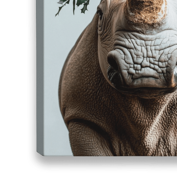 Mit einem majestätischen Ausdruck und einem festlichen Kranz aus grünen Blättern und roten Beeren thront das Nashorn im Mittelpunkt. Diese humorvolle und zugleich beeindruckende Darstellung bringt einen Hauch von Überraschung und Freude in jedes Wohnzimmer und ist ideal für Tierliebhaber, die ihren Wohnraum mit unkonventionellem Charme bereichern möchten.