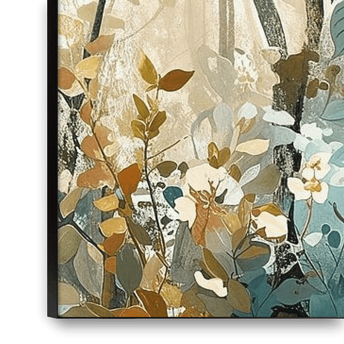 Nature Abstract - Dieses Panoramagemälde lädt den Betrachter in eine verträumte Waldlandschaft ein, die elegant mit einer Palette aus subtilen Erdtönen und sanften blauen Akzenten dargestellt ist. Mit seiner abstrakten Darstellung von Blättern und Blumen bringt das Gemälde ein organisches Gefühl in jeden Raum. Das Spiel von Licht und…
