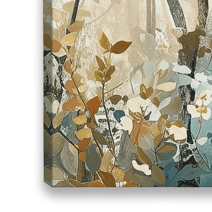 Nature Abstract - Dieses Panoramagemälde lädt den Betrachter in eine verträumte Waldlandschaft ein, die elegant mit einer Palette aus subtilen Erdtönen und sanften blauen Akzenten dargestellt ist. Mit seiner abstrakten Darstellung von Blättern und Blumen bringt das Gemälde ein organisches Gefühl in jeden Raum. Das Spiel von Licht und Schatten verleiht dem Bild Tiefe und Textur, so dass es sich sowohl in klassische als auch in ländliche Einrichtungen perfekt einfügt.