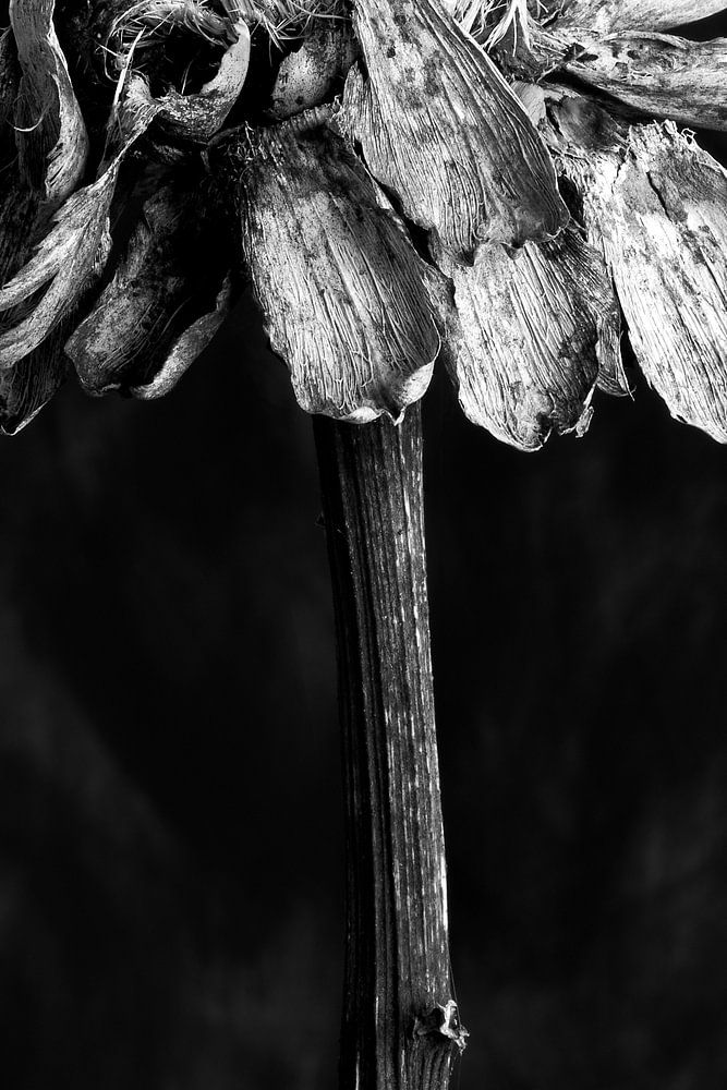 Eine Freundin gab mir die toten Blumen aus ihrem Garten. Ich habe sie in meinem Studio vor einer von mir selbst bemalten Leinwand fotografiert. Mit natürlichem Tageslicht, das, von der Seite betrachtet, die Details und Strukturen schön zur Geltung bringt.