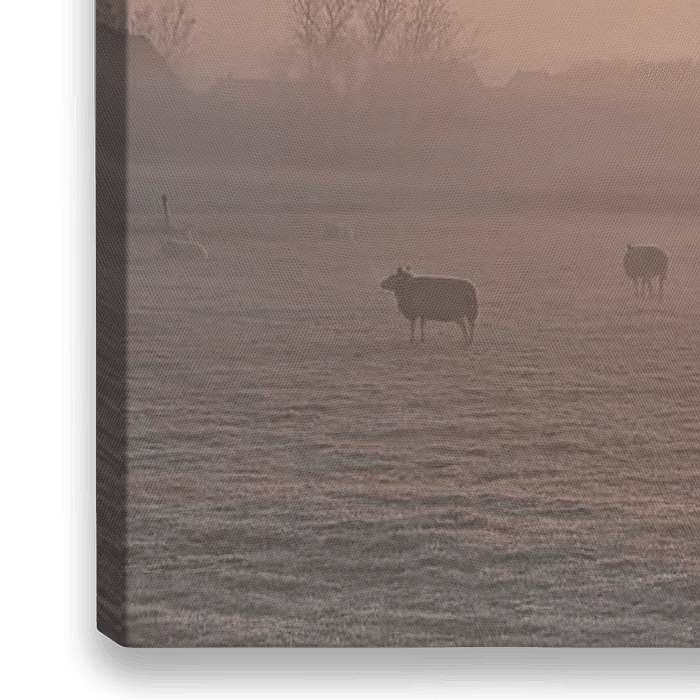 Bei Sonnenaufgang ist es auf Texel neblig. Wunderschöne Nebelbänke hängen über dem Land um das Dorf Den Hoorn. Mit Kirche, Schafen, Zaun und Graben ein echtes niederländisches oder Texeler Bild!