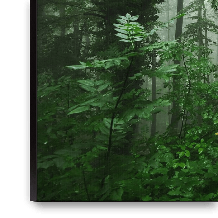 Ein nasser, nebeliger Laubwald am Morgen mit saftig grünen Bäumen. Feuchte Luft und tropfende Blätter.