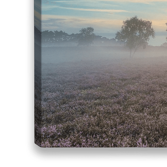 Sonnenaufgang in der blühenden Heidelandschaft bei Haltern am See im Münsterland an einem nebligen Sommermorgen.