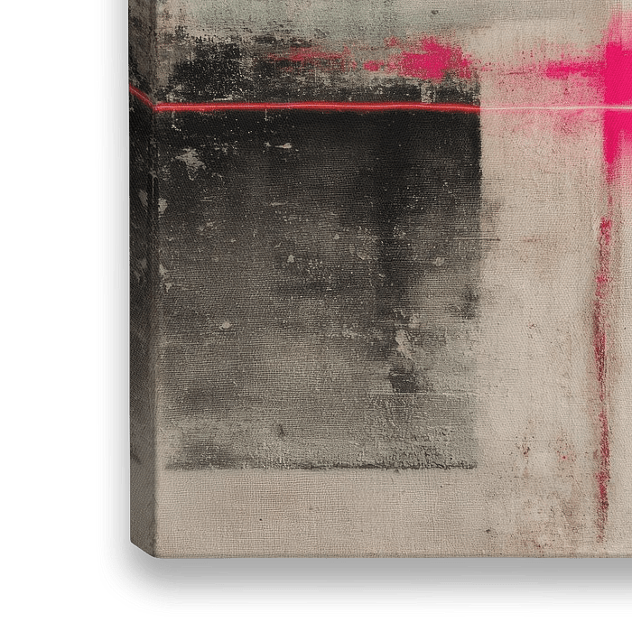 Das Werk kombiniert natürliche Unvollkommenheit mit einer modernen, urbanen Note. Das Gleichgewicht zwischen grauem Beige, verwittertem Schwarz und dem leuchtenden Neon-Pink macht es sowohl minimalistisch als auch auffällig.