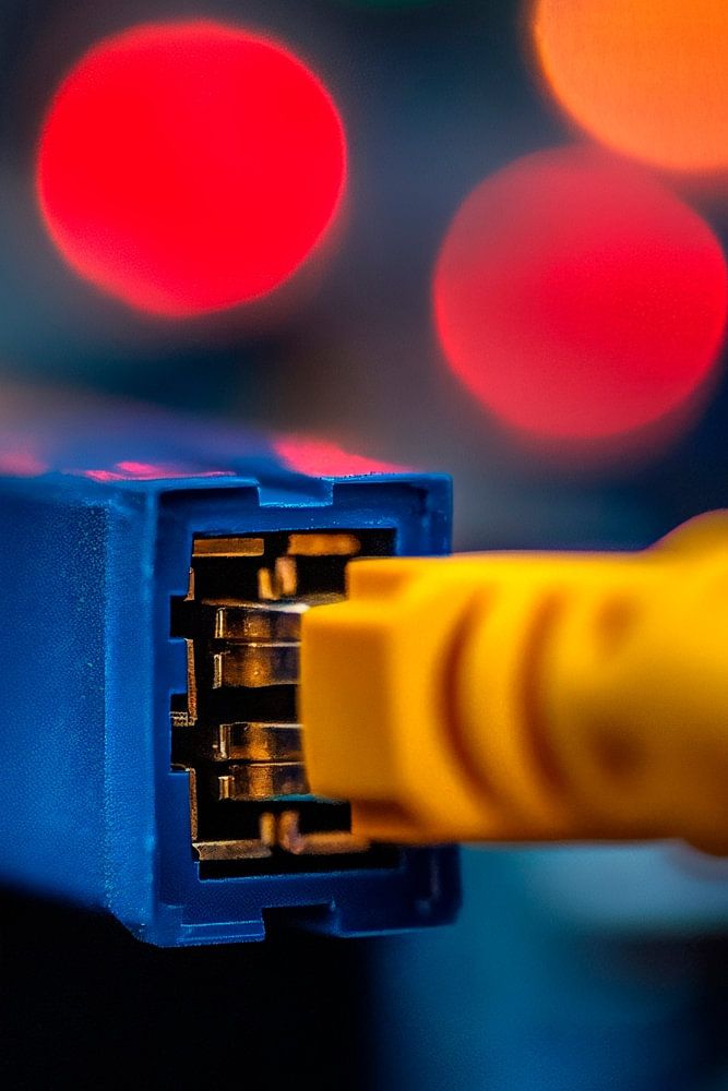 Ein strahlend gelber Netzwerkkabel steuert mit seiner lebhaften Verbindung zu einer bunten Lichterwelt. Die verschwommenen, leuchtenden Punkte im Hintergrund vermitteln ein Gefühl urbaner Energie und technologischer Vernetzung. Dieses Bild eignet sich hervorragend für ein modernes Büro oder einen kreativen Arbeitsbereich, wo Inspiration und Innovation gefördert werden.