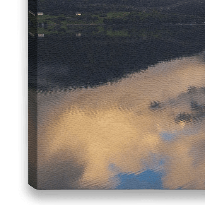 Ein Bild von einem frühen Sommermorgen am norwegischen Hardangerfjord mit tief hängenden Wolken, die sich im stillen Wasser des Fjords spiegeln.