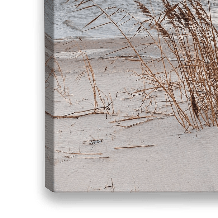 Dieses Foto fängt eine ruhige Strandszene bei Sonnenaufgang ein. Im Vordergrund stehen hohe, goldbraune Schilfrohre vor einem Hintergrund aus weichem, weißem Sand. Das Meer mit seinen sanften Wellen erstreckt sich in der Mitte des Hintergrunds und trifft auf den Horizont unter einem dramatischen Himmel voller dunkler, stürmischer Wolken. Die aufgehende Sonne wirft ein subtiles Licht, das die ruhige und doch atmosphärische Stimmung noch verstärkt. Die gesamte Farbpalette ist eine Mischung aus erdigen Tönen und kühlen Blautönen, die ein Gefühl von Ruhe und Einsamkeit hervorrufen.