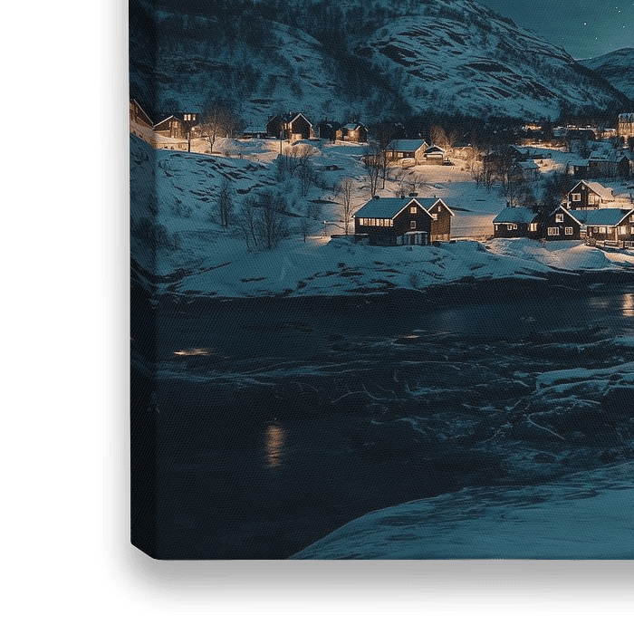 Das Gemälde "Norwegischer Nachthimmel" erweckt den Zauber einer stillen skandinavischen Nacht zum Leben, in der die Nordlichter anmutig über einem kleinen Dorf in den Bergen tanzen. Das Gemälde zeigt charmante norwegische Hütten, deren warmes Licht aus den Fenstern einen schönen Kontrast zum tiefblauen Himmel und den funkelnden Farben…