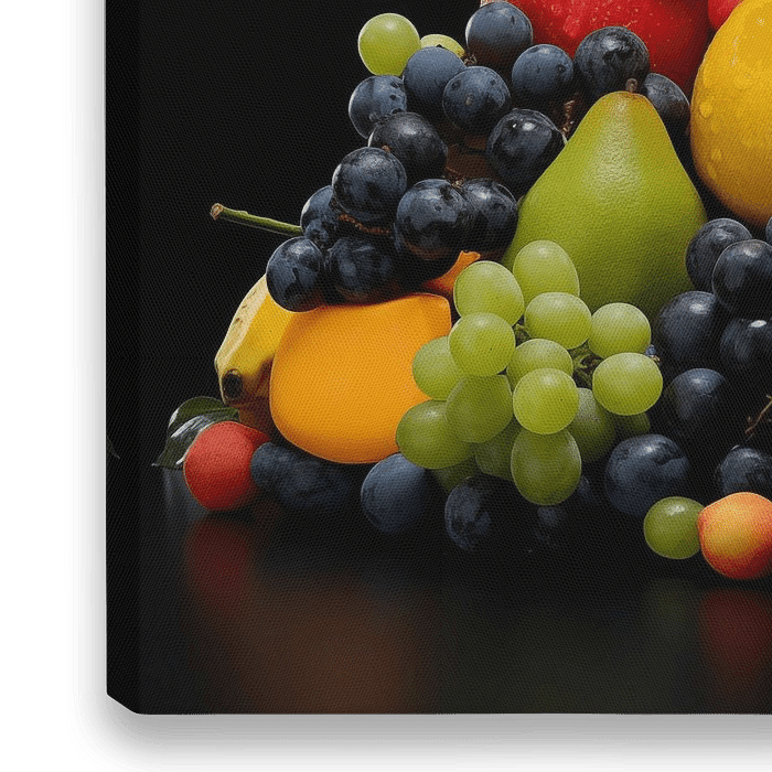 Das Obstgemälde ist ein lebendiges und raffiniertes Kunstwerk, das die Frische und Farbenpracht von frischem Obst elegant einfängt. Auf diesem Fotodruck ist eine Auswahl an saftigen Früchten - wie Äpfel, Trauben, Zitrusfrüchte und Beeren - detailliert vor einem tiefschwarzen Hintergrund abgebildet. Dieser Kontrast sorgt dafür, dass die…
