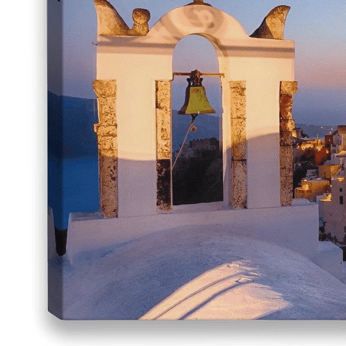 Schöner Sonnenuntergang mit blauem Himmel und Blick auf die Glocke der Kapelle und blauen Dächern, während im Inneren die Lichter in Oia, Santorini, Griechenland.
