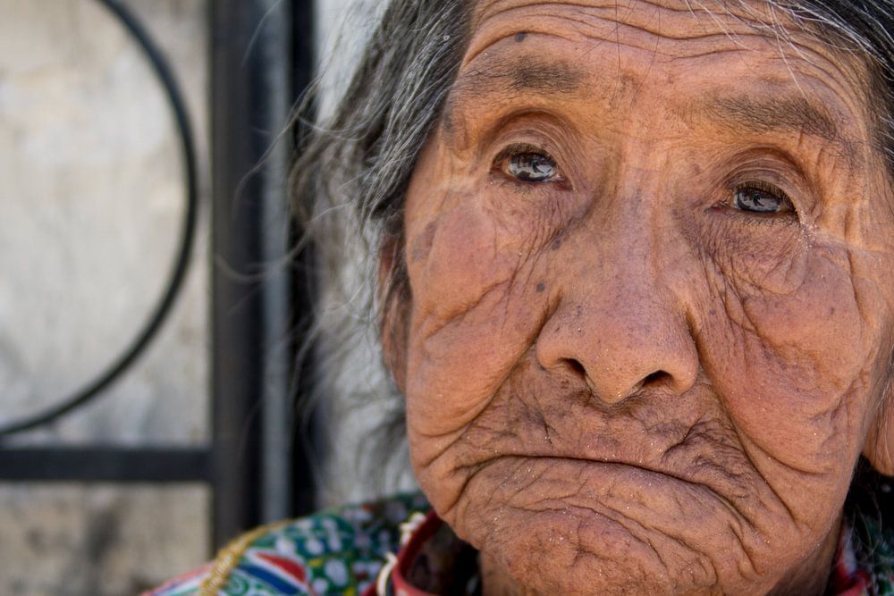 Oude indiaanse vrouw uit peru met zichtbare levenservaring