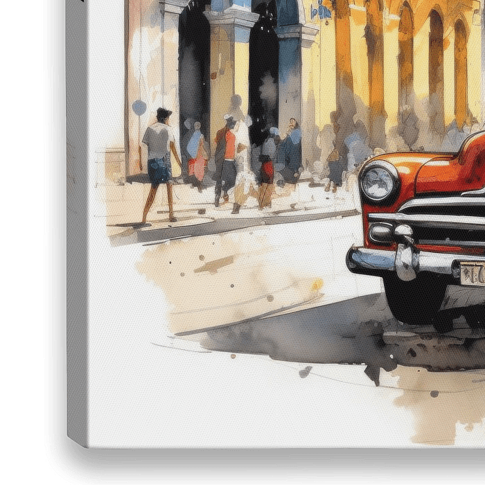 Ein roter Oldtimer auf den Straßen von Havanna. Das digital erstellte Bild wirkt wie ein illustratives Aquarellgemälde.