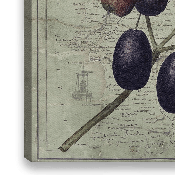 Dieses Design kombiniert verschiedene Elemente - eine alte Illustration eines Olivenzweigs mit reifen Oliven, eine alte Landkarte Portugals, eine Titelseite eines alten Buches mit dem Titel "Arte de…
