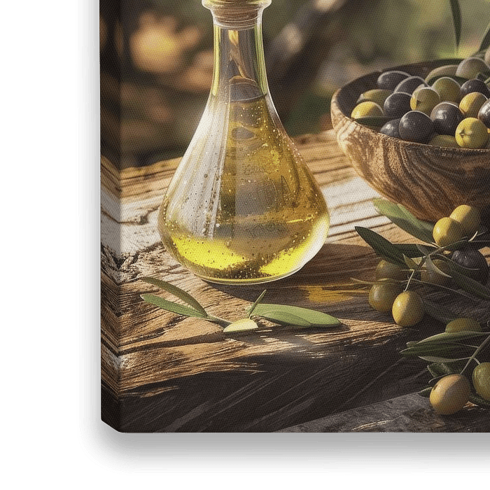 Dieses farbenfrohe Stillleben fängt die Essenz des mediterranen Lebens ein. Reife Oliven und goldene Olivenölflaschen ruhen auf einem rustikalen Holztisch, umgeben von üppigen Olivenbäumen unter der warmen Sonne. Die detailreiche Darstellung und die lebendigen Farben transportieren Sie direkt in eine mediterrane Landschaft, ideal für…