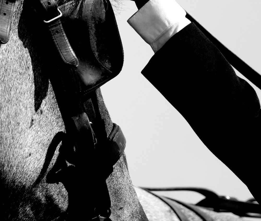 Fraaie zwart-wit plaat in de sfeer van verleden tijden met paard en met hoge hoed.
