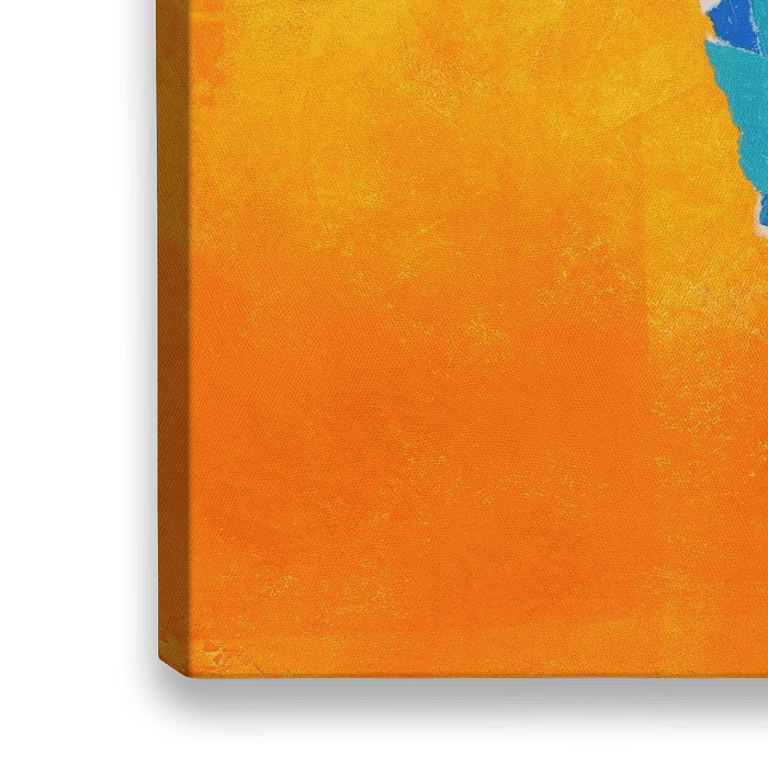Eine einzelne frische Orange in einer blauen Schüssel auf einem lebhaften orangefarbenen Hintergrund ist das Thema dieses Mixed-Media-Kunstwerks. Ich habe ein Gemälde begonnen, aber es hat mir nicht gefallen. Deshalb habe ich alles zerrissen und aus den Papierfetzen eine Collage erstellt. Jetzt gefällt es mir. Es sieht aus wie ein Mosaik.