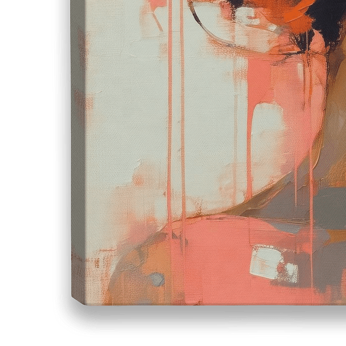 Orange Woman - Dieses moderne Frauenporträt kombiniert leuchtende Orangetöne mit abstrakten Texturen. Die Frau wirft einen Blick zur Seite und setzt sanfte weiße und schwarze Akzente im Gesicht.